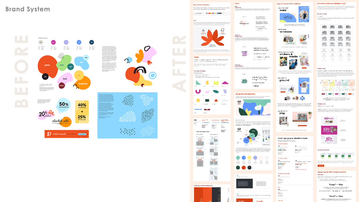 My team's work kicked off with a mood board from our agency partners that reflected the visual territory our customers reacted most favorably to. We studied the research and customer insights and began to build out colors (adjusting for ADA accessibility with white and gray type), shapes, linework, and typography elements. We set guidelines for how they should be used and how they work together. We built reusable content and templates with this new system to enable our designers to create confidently and efficiently with the new elements. We did all of this in 3 quarters!