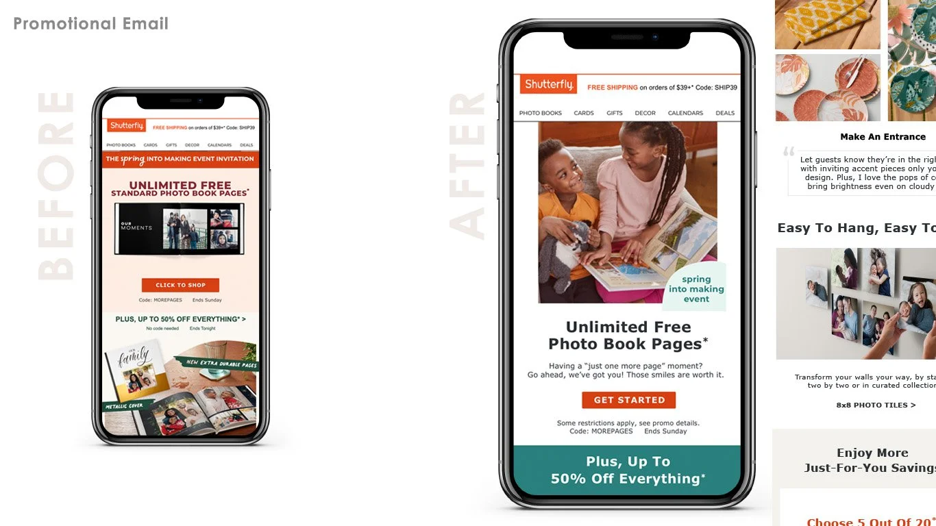 Shutterfly is a 20+ year company known primarily for customer-built photo books and other designed goods. In a saturated market, they found themselves losing relevancy, their new customer growth slowing. One of the strategies for change was reinventing the look and feel of the Brand.