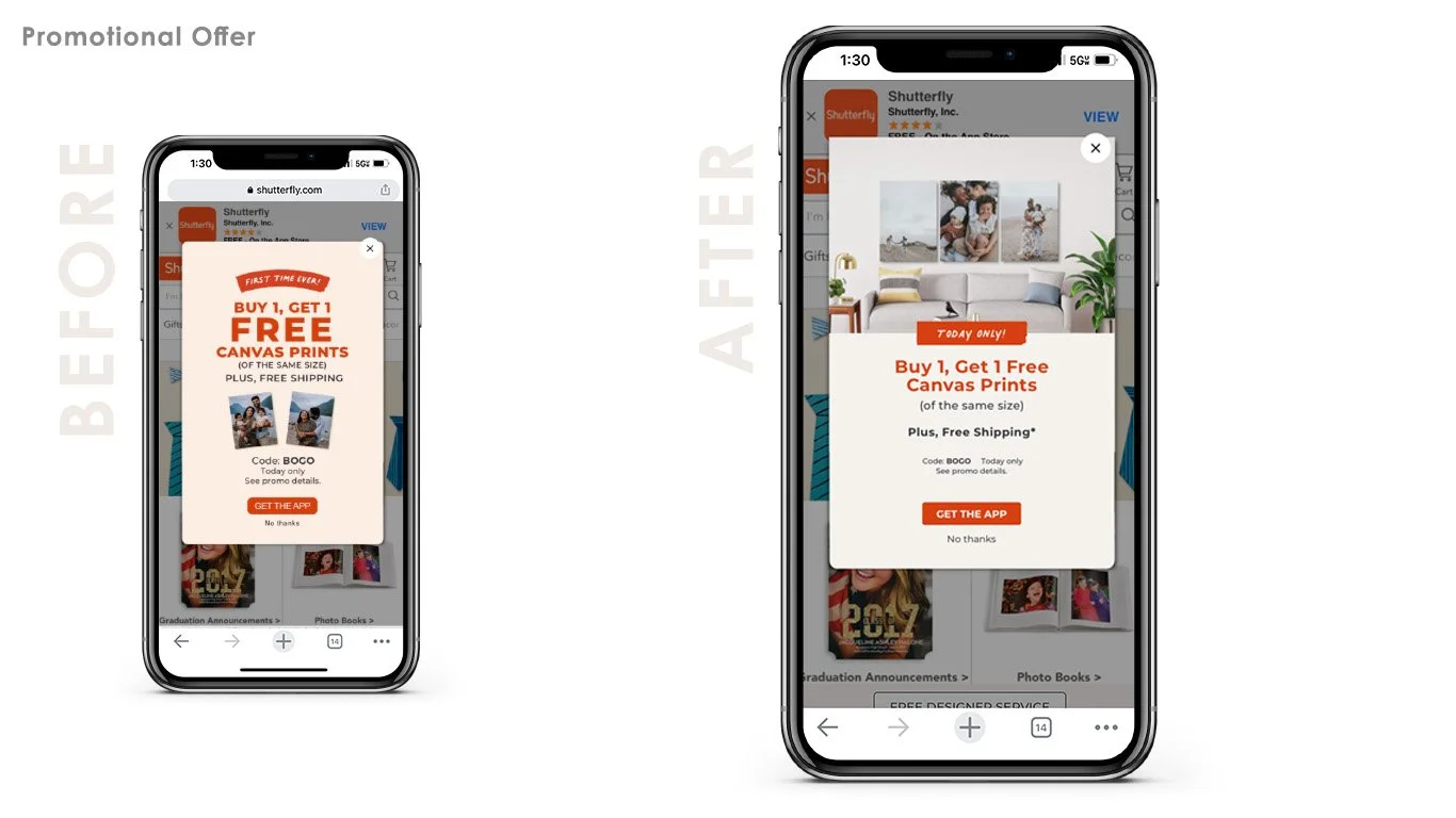 Our m-dot blockers were so promotion-heavy and dense in their design, they were often closed out without customers registering or retaining the information. We partnered with our promo designers and marketing leaders to redesign this experience to better serve our customers. We introduced a large lifestyle image component featuring the product in an inspirational way and discontinued the use of complex type lockups. We moved to a highly readable live-type style, defined a consistent color palette for promotions from our core brand palette, and created reusable templates for our designers to leverage, increasing efficiency and massively reducing time between kick-off and hand-off. We also succeeded in creating a consistent promotional experience for the customer for the first time, increasing readability, speed of message retention, and inspirational content to drive conversion.