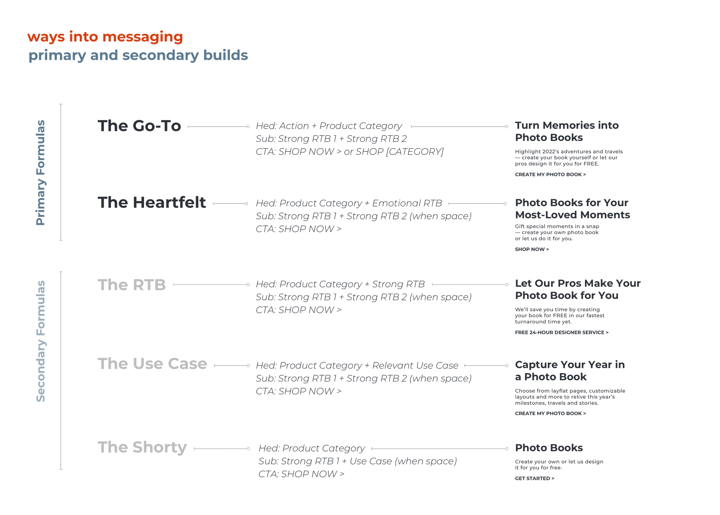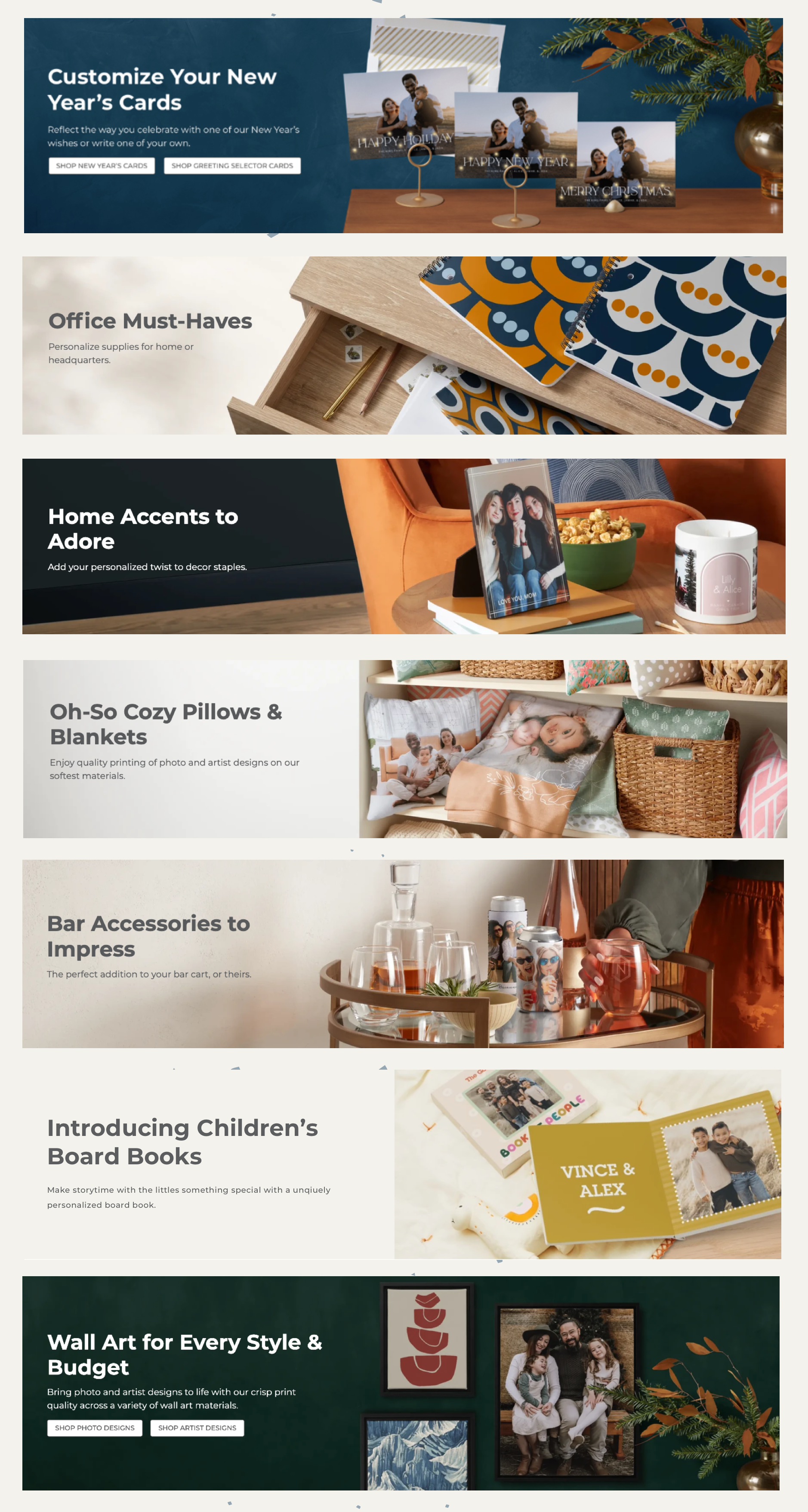 The systems and copy teams worked across the organization, from Creative and Marketing to Product and Ecom Ops, to implement the new messaging approach. The update to messaging on site was a particularly heavy lift requiring the coordination of hours and timelines between multiple contributors. The site messaging across Homepage, Category, and Sub-Category pages was updated in a matter of days, in time for some of our biggest sales of the season. Shutterfly saw record sales numbers in December.