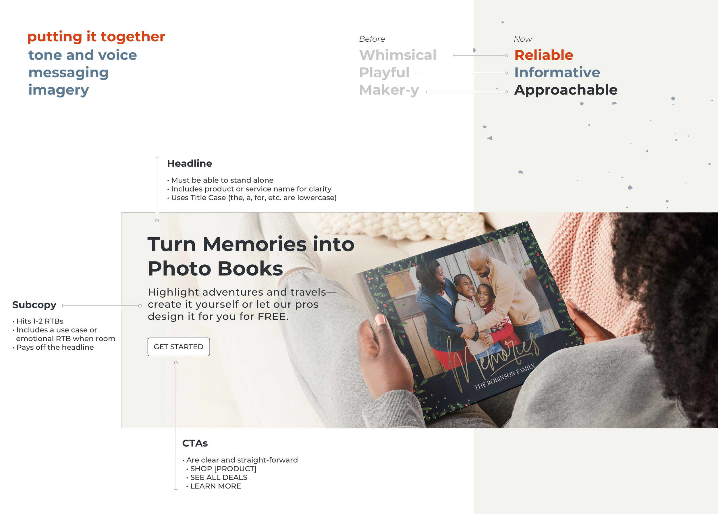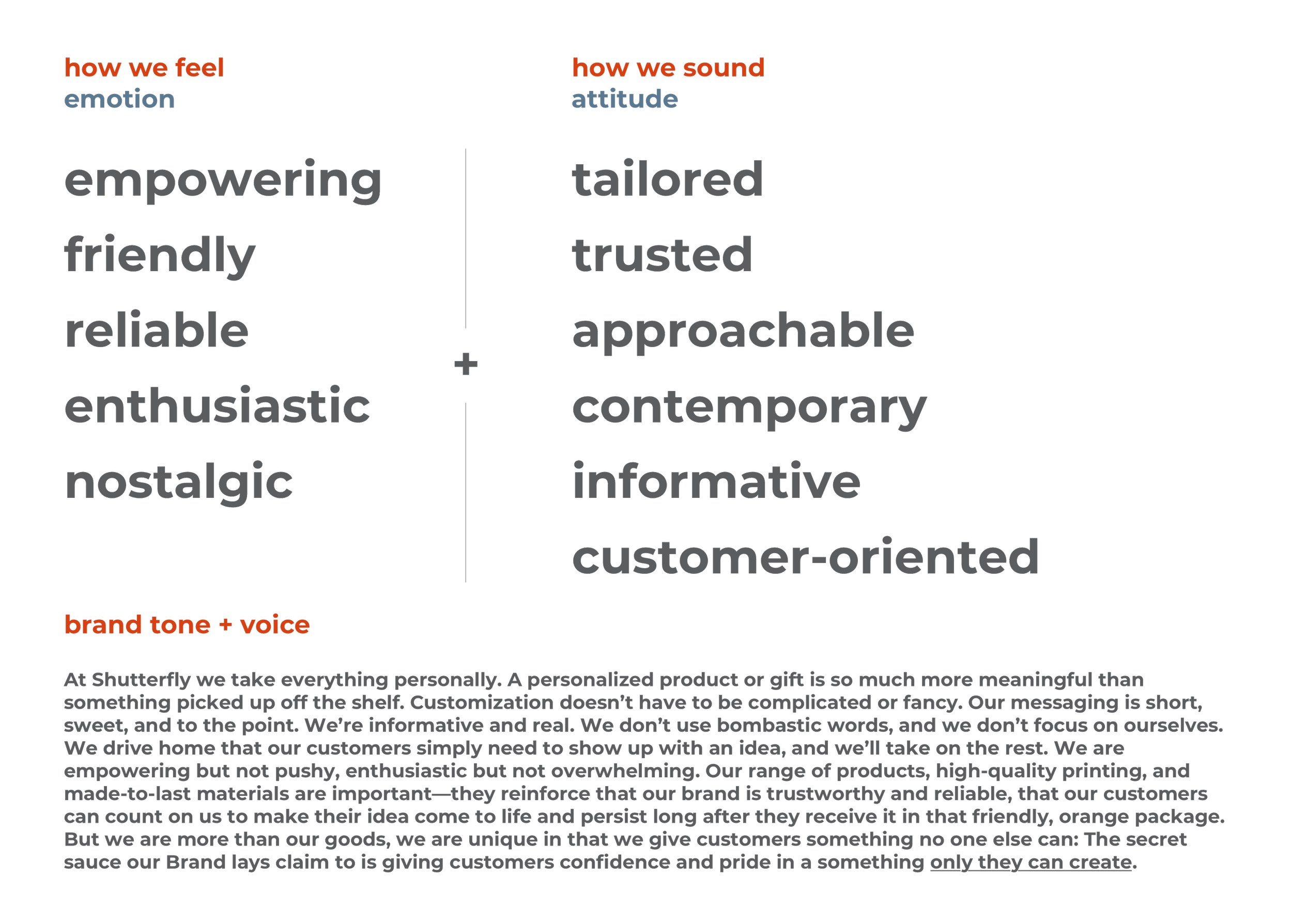 Redefine our messaging to align with the shift in the Shutterfly brand positioning and visuals. Workshop how we sound now, how we don’t sound now, and how we want to sound in the future. Define the way we speak to our customers, build the rules and guidelines for using the new tone and voice, and consult on the rollout across channels.